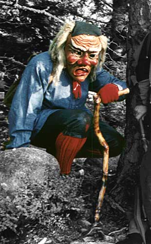 Schnürrstiefeln gekleidet. Die Holzmaske ist mit struppigen Hanfhaar umsäumt. Den Kopf
