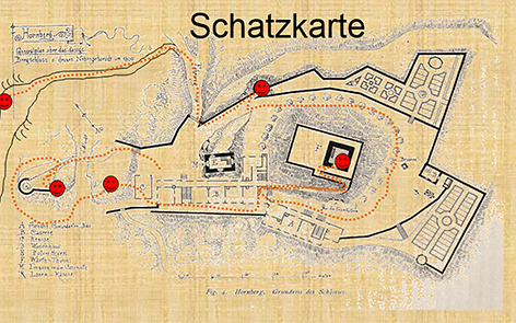 Mit Hilfe dieser Karte musste jedes Kind seinen eigenen, auf dem Schlossareal versteckten Schatz suchen. Aus der Felsengrotte heraus, wieder am Tageslicht angekommen, bestieg man noch gemeinsam den Schlossturm, bevor die Schatzsuche begann.